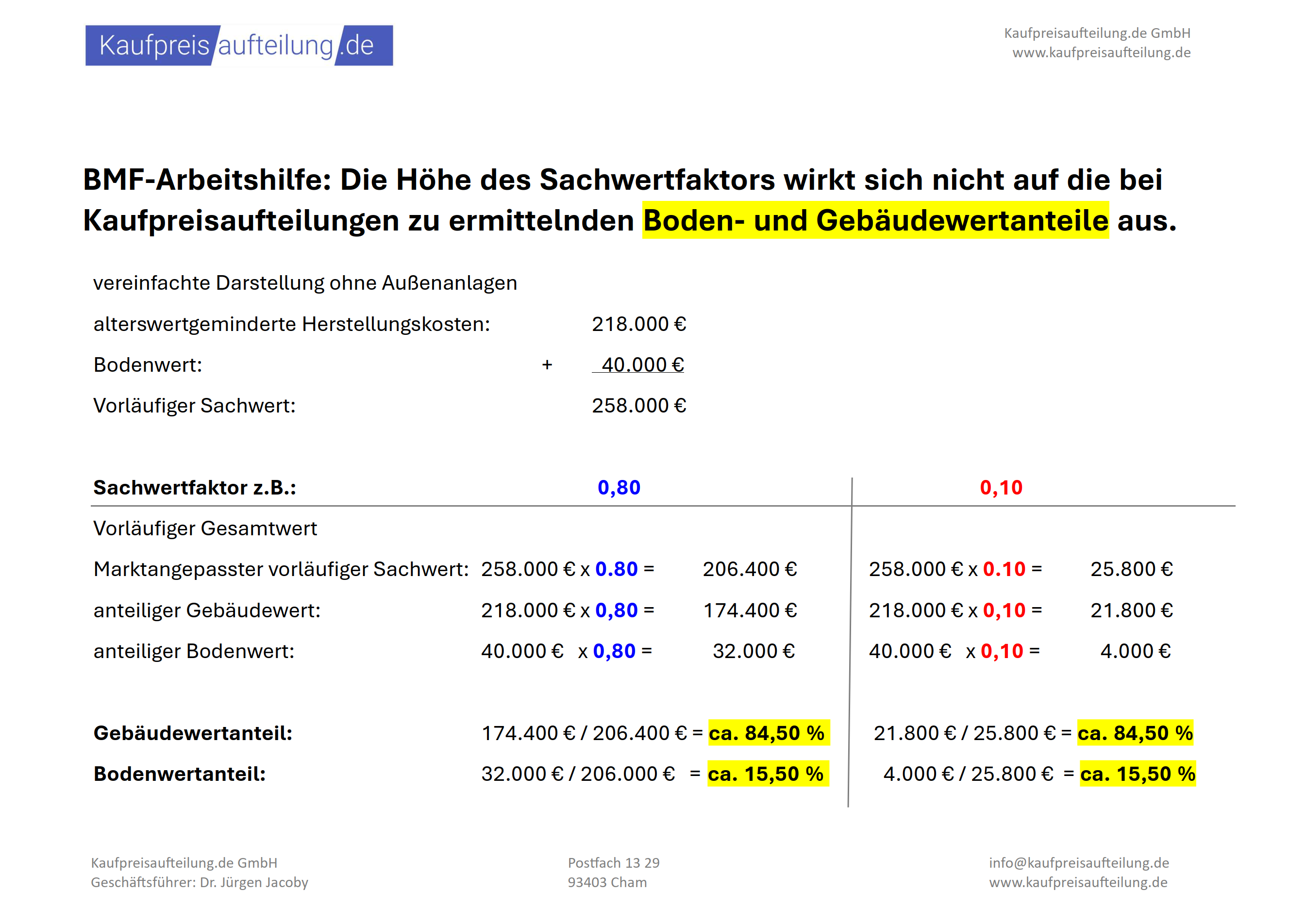 Denn beim in der BMF-Arbeitshilfe beinhalteten typisierten Sachwertverfahren kommen gem. dem nachfolgenden Beispiel mathematisch unabhängig von der Höhe des Sachwertfaktors, hier z.B. 0,80 und 0,10, stets dieselben Gebäude- und Bodenwertanteile heraus, so dass lediglich regionale Gebäudekosten ohne Marktbezug in die BMF-Arbeitshilfe einfließen: