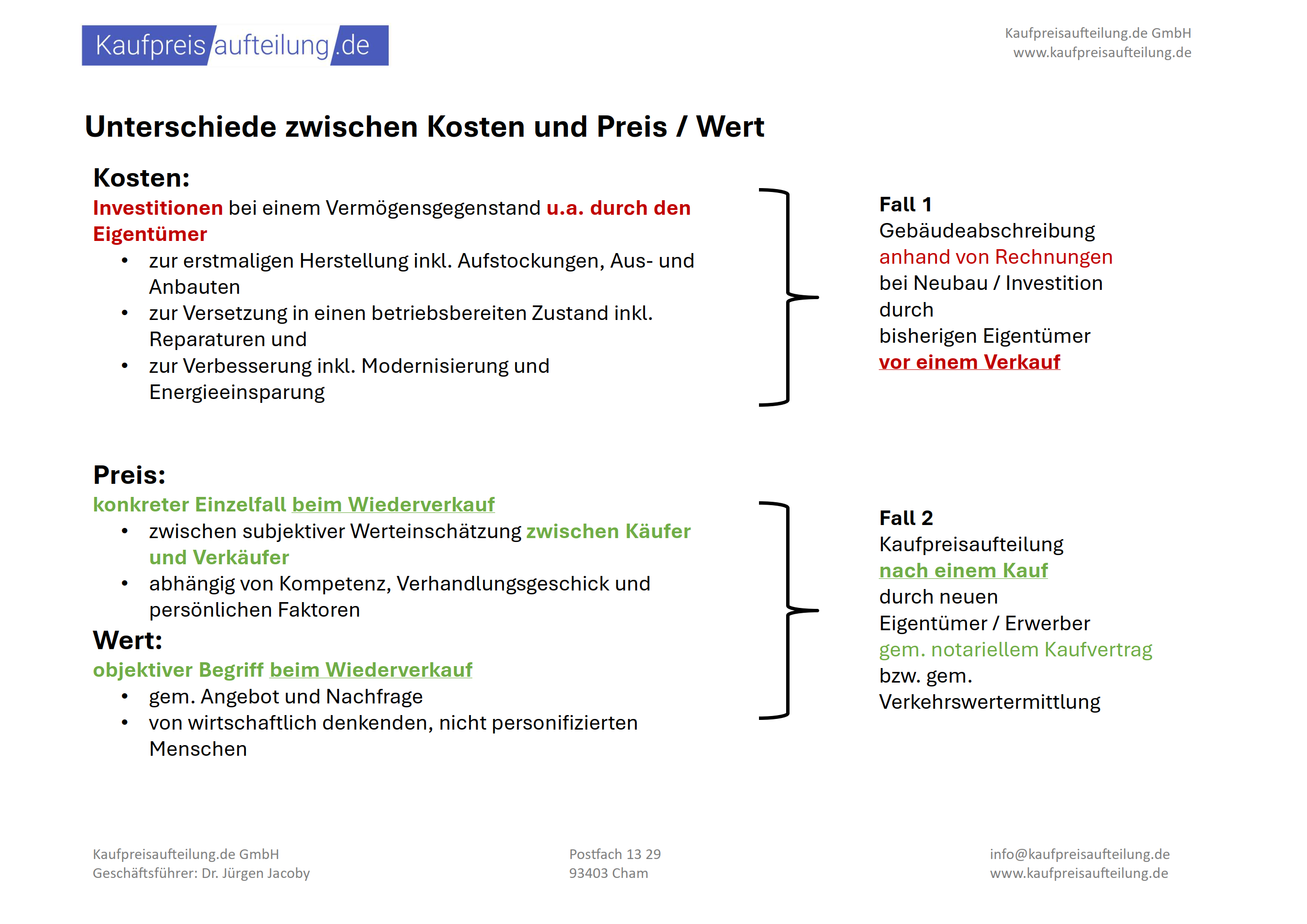 Ursächlich hierfür ist, dass die für die BMF-Arbeitshilfe verantwortliche Bund-Länder-Arbeitsgruppe den in der Verkehrswertermittlung wesentlichen Unterschied zwischen „Wert“ und „Preis“ einerseits sowie „Kosten“ andererseits trotz anderslautendem BFH-Urteil vom 21. 07. 2020, IX R 26/19 (a. a. O.). Rz. 36 ff. ignoriert und somit ihrer „Kaufpreisaufteilung unzulässige Parameter zugrunde legt“, so dass deren „Schätzung daher keinen Bestand haben kann“.